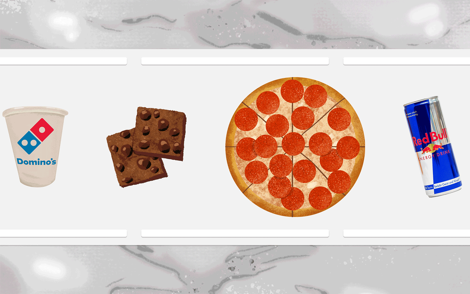 Illustrations for Speedybites, a Red Bull video game created in partnership with Domino's and Pizza Hut. Games are browser-based, and players can assemble menu items for redeemable points while they wait for their orders.